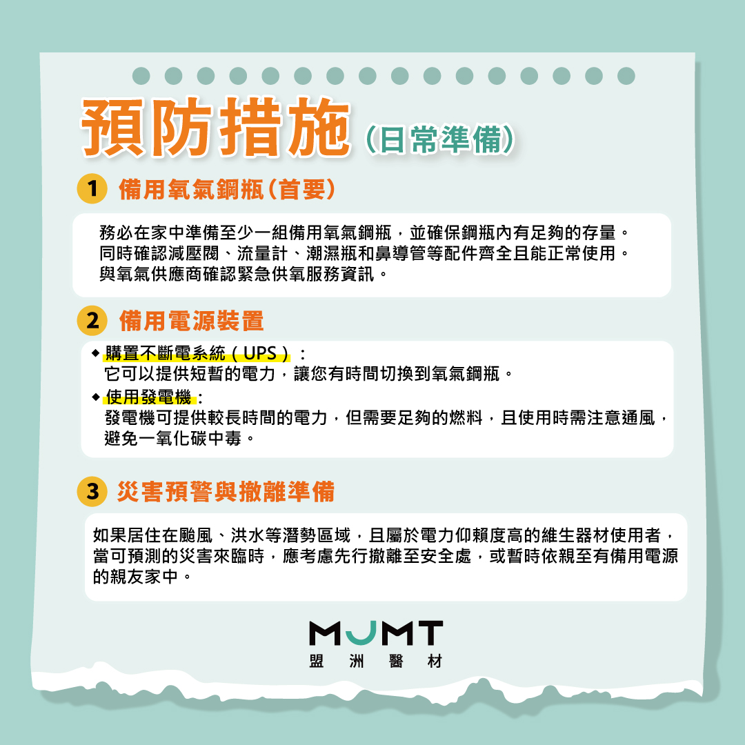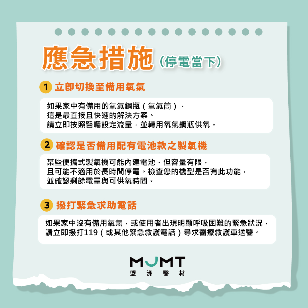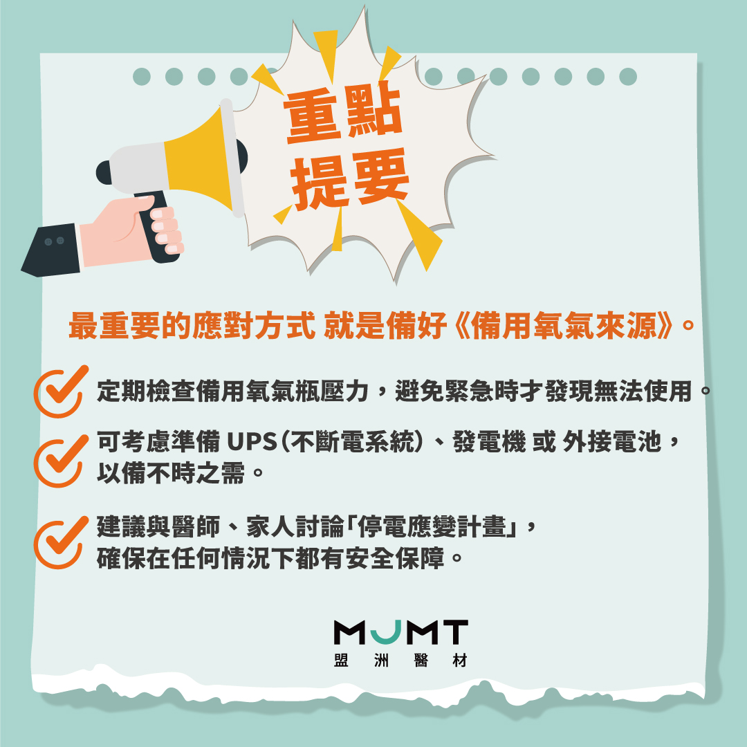 - 考慮購置不斷電系統(UPS):它可以提供短暫的電力,讓您有時間切換到氧氣鋼瓶。