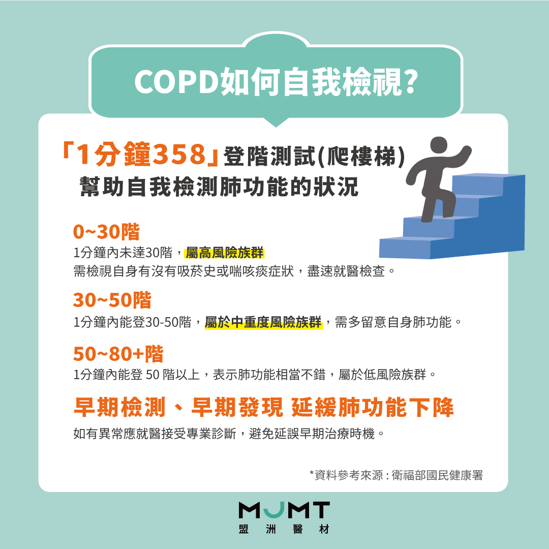 0~30階:如果1分鐘內,登階未達30階,屬於高風險族群,需檢視自身有沒有吸菸史或喘咳痰症狀,盡速就醫檢查。