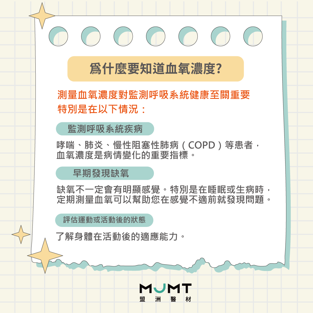 測量血氧濃度對監測呼吸系統健康至關重要,特別是在以下情況: